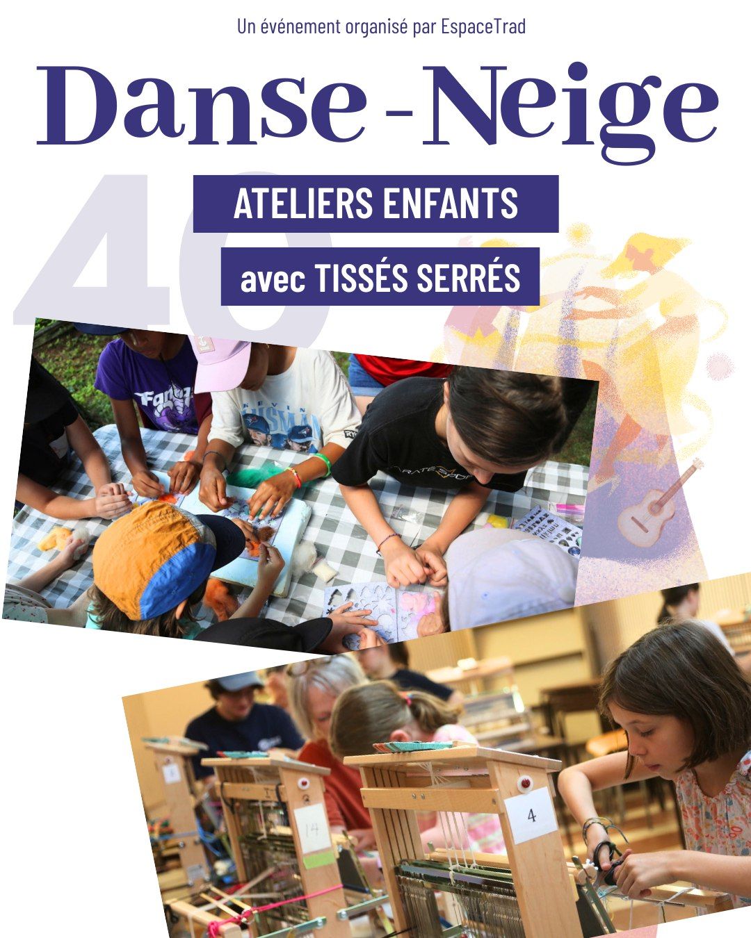 Cette année, la programmation jeunesse du camp Danse-Neige d'EspaceTrad est confiée à Tissés Serrés, plus précisément à l’équipe derrière la Semaine de découvertes complètement TRAD, reconnue pour son approche ludique et immersive des arts traditionnels québécois. 👞