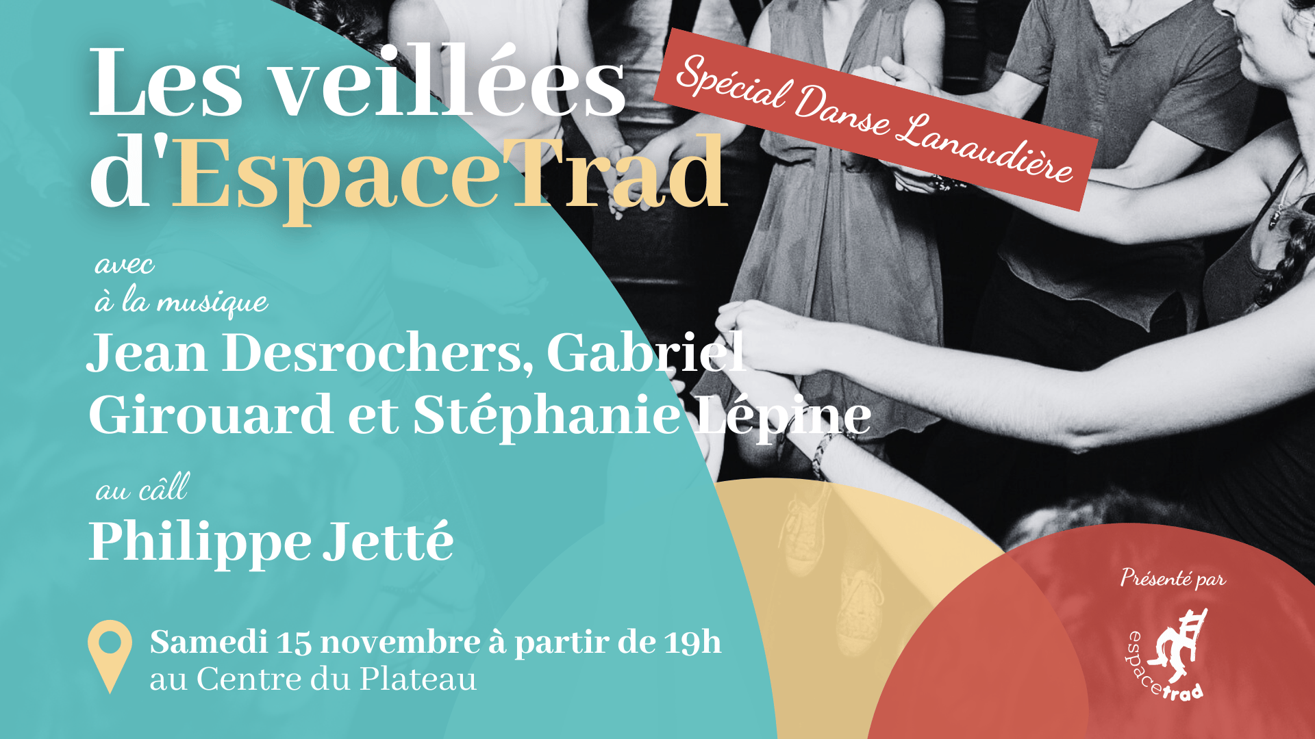 ![]() | Les veillées de danse d’EspaceTrad se poursuivent. Prochaine veillée : samedi 15 novembre au Centre du Plateau, spéciale danse de Lanaudière! |